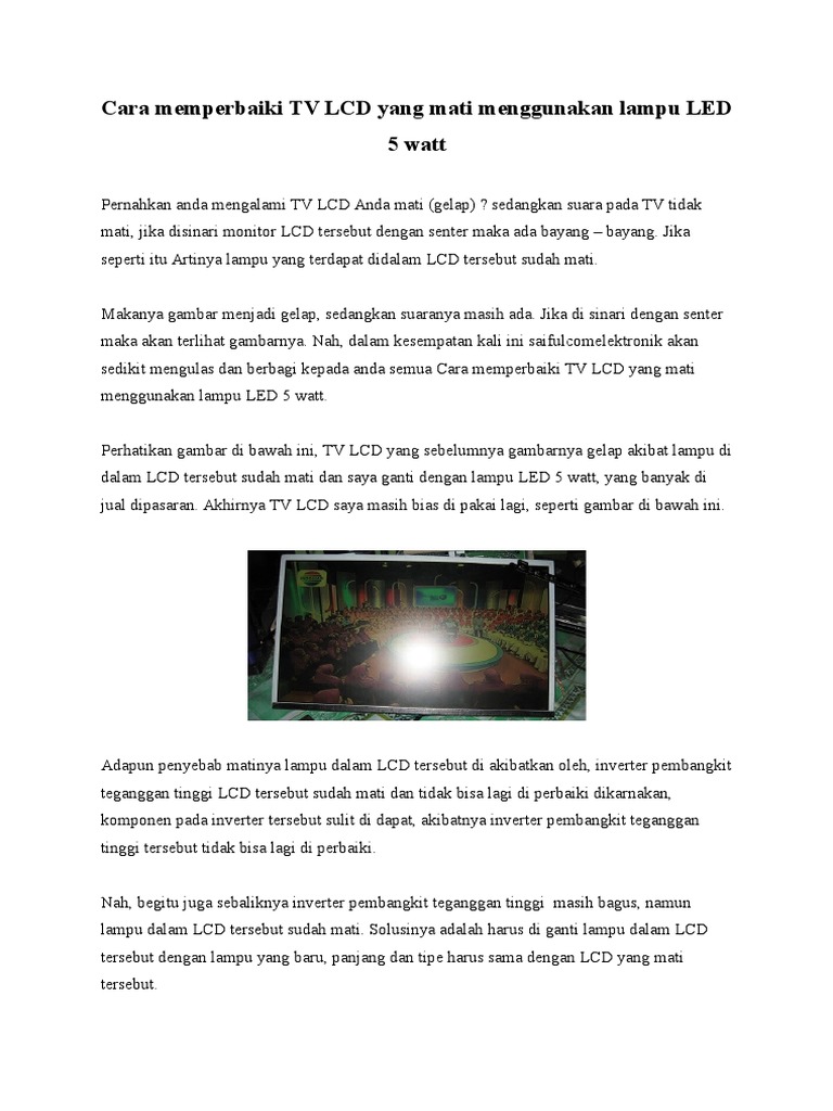 Pada tv samsung yang menggunakan ic singgle sering terjadi kerusakan gambar gelap suara ada jika screen diputar gambar blanking redup.untuk kasus seperti ini kerusakan terletak pada ic matrik/video amp yang ada pada soket tabung ,icnya menggunakan tda6107q pada ic ini kemungkinan tegangan. Berikut cara sederhana untuk memperbaiki tv lcd rusak. Maka setelah kita kasih sinar di depan layarnya maka akan kelihatan gambarnya, itu menandakan layar tidak problem atau bermasalah.jadi yang bermasalah hanya lampu backligt saja. Tidak ada video dapat juga disebabkan oleh kegagalan papan inverter, tapi ini tidak umum di tv 44 responses to tv lcd/led ada suara tidak ada gambar. Kerusakan tv led ada suara tidak ada gambar pada tv led ukuran di bawah 32 inch biasanya disebabkan karena masalah di.